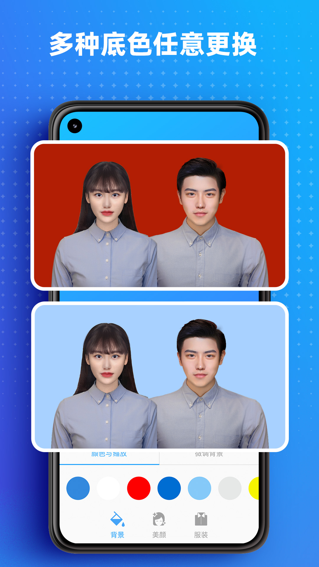 【专业背景换色】软件支持一键更换证件照背景颜色,提供标准的白底、蓝底、红底等多种选择,确保您的证件照完全符合各类证件办理要求。