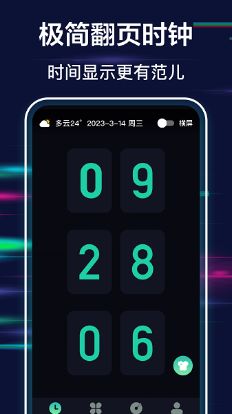 1、表盘配置,横屏竖屏,任意配置,即用即用。软件自动适应设备方向,无论您如何持握设备,都能获得最佳的时钟显示效果。