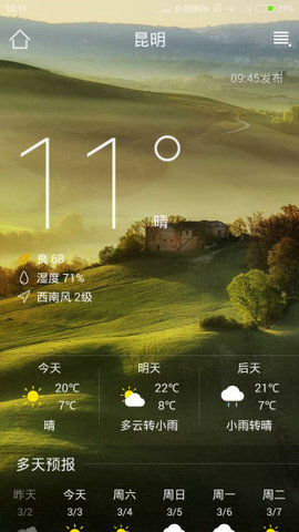 3、24小时天气预报。提供逐小时温度、降水概率、风速等详细数据曲线图。新增天气变化动画模拟功能,直观展示未来一天天气演变过程。