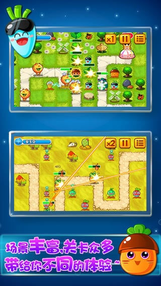 萝卜保卫战是一款集休闲娱乐与策略塔防于一体的手机游戏,凭借其独特的Q版画风和轻松愉快的游戏氛围,成为众多玩家休闲时光的首选。游戏以清新可爱的萝卜形象为核心,搭配欢快的背景音乐和诙谐的角色音效,为玩家营造出一个充满欢乐的奇幻世界。在玩法上,游戏延续了经典塔防模式,玩家只需点击屏幕即可建造炮塔抵御怪物进攻,通过升级炮塔和合理布局来提升防御能力。此外,游戏还贴心地设计了图鉴系统,方便玩家随时查阅各类炮塔的详细信息,让策略制定更加得心应手。