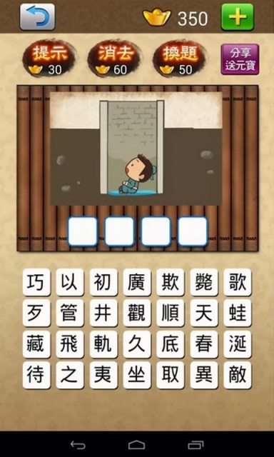 这是一款融合传统文化与现代趣味的看图猜成语游戏,背景设定在中国古代著名书院中。相传这些书院不仅藏有珍贵的典籍,还埋藏着不为人知的宝藏。古代智者为了守护这些珍宝,巧妙地用"书中自有黄金屋"的隐喻来掩盖真相,引导人们关注知识而非物质财富。然而,这些宝藏确实存在于书院的某个角落。玩家将扮演一位发现书院秘密的探索者,需要通过解开一道道精心设计的成语谜题,才能逐步揭开宝藏的秘密。游戏以生动有趣的图画呈现成语内涵,让学习成语变得轻松愉快。
