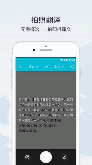 智能拍照翻译:优化后的拍照翻译流程更加人性化,自动识别文本区域并即时显示翻译结果,支持原文和译文的对照查看和编辑修改,确保翻译准确性。