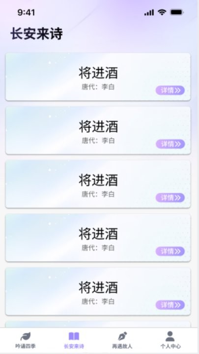2、软件特别设计了"四时之美"主题板块,通过精选的四季诗词,带您领略长安的诗意风光。每首诗词都配有详细的注释和赏析,让您不仅能背诵,更能深入理解诗词背后的文化内涵。