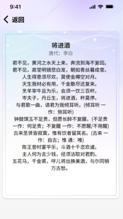 4、软件致力于将古诗词融入现代生活,设计了每日一句、诗词打卡等功能,让优美的诗句成为您生活中的一部分。无论是晨起阅读还是睡前品读,都能找到合适的诗词陪伴。