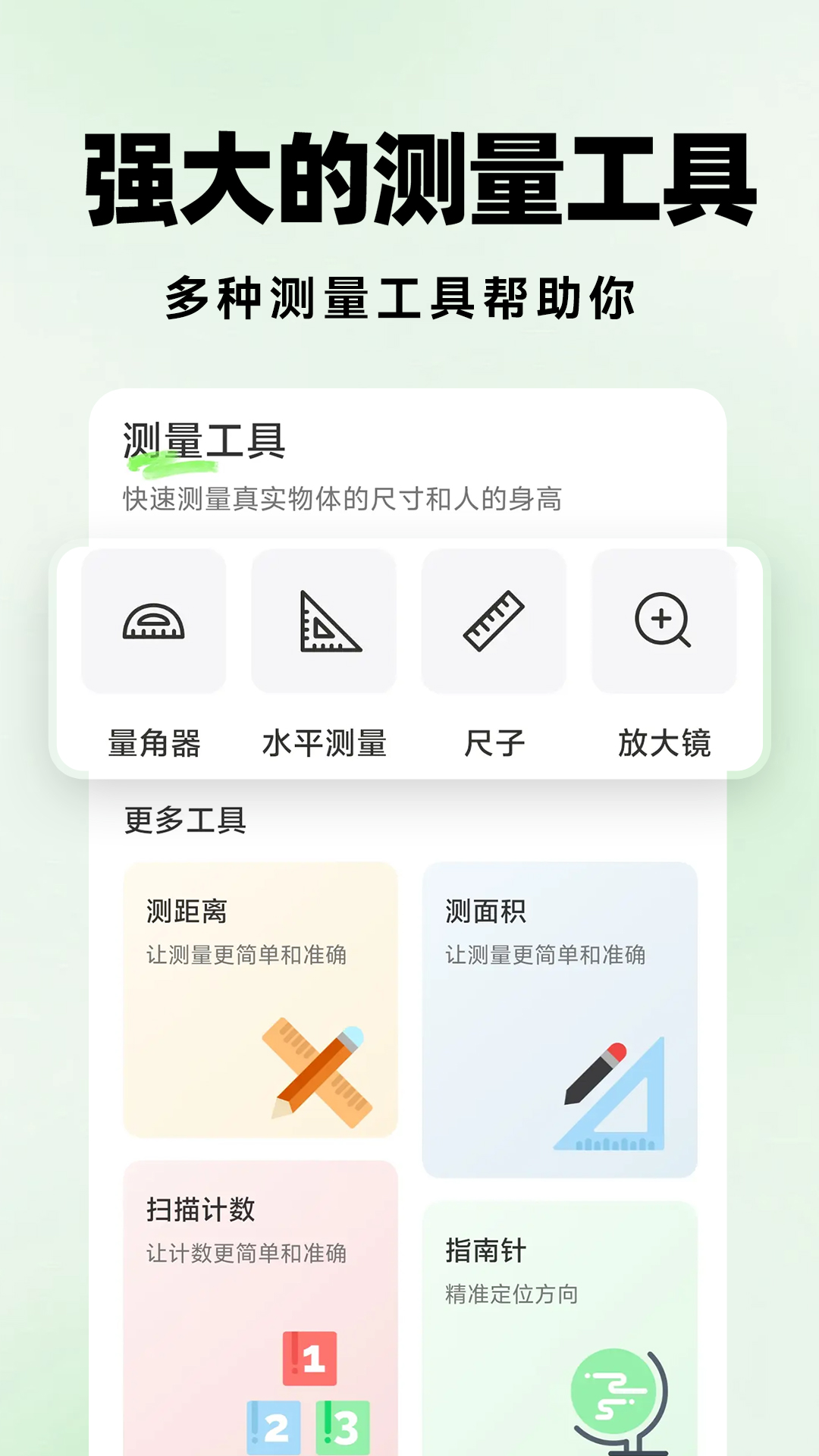 本款测量工具包含量角器、水平仪、尺子测距、放大镜、面积测量(测亩仪)、扫描计数等多种专业功能,能够满足不同场景下的测量需求。量角器可精确测量角度,水平仪帮助您快速校准水平面,尺子测距功能支持多种单位切换,放大镜则能清晰查看微小细节。面积测量功能特别适合土地测绘和农业应用,扫描计数功能可快速统计物品数量。所有功能均经过优化,确保测量数据精准可靠,为您的工作提供有力支持。