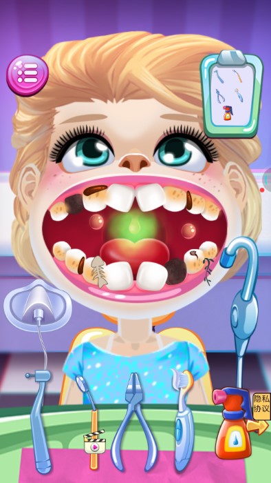 在游戏中,我们需要帮助每个小朋友解决他们的牙齿问题。治疗过程中,玩家需要使用各种牙科工具,如探针、牙钻、填充材料等,通过精准的操作来完成治疗任务。完成牙齿清洁后,玩家还可以为小患者进行牙齿美容,用不同颜色的牙箍、美牙贴纸装饰牙齿,并用可爱的帽子和眼镜装扮小朋友,让他们带着灿烂的笑容离开诊所。