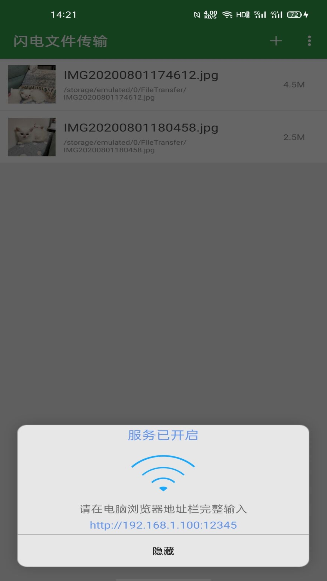 3、智能服务器功能是闪电文件传输App的一大亮点,只需在手机端开启内置服务器,系统就会自动生成一个动态访问地址,通过浏览器即可实现文件上传、下载、管理等全套操作。
