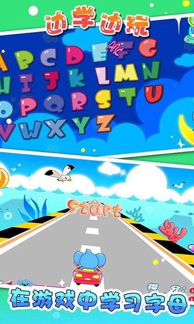 -Q版字母:设计超Q的字母形象和卡丁车等趣味元素,色彩鲜艳,形象可爱,大大提高宝宝认知的兴趣和记忆效果。