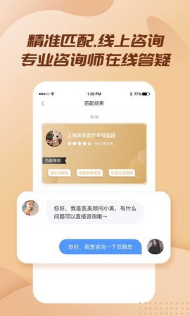 3、精准匹配,线上咨询,专业咨询师在线答疑:24小时在线咨询服务,由专业医美顾问团队提供个性化建议,解答各类美容疑问。