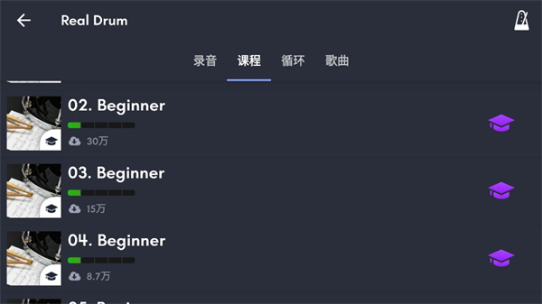 3、点击圆形录音按钮即可开启创作模式,系统会完整记录每个演奏细节。当玩家熟练掌握基本技巧后,可以尝试编排原创节奏,录制专属音乐作品,并与好友分享演奏成果。