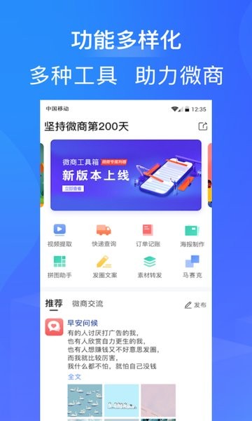 【功能多样化】 集成了20余种实用工具,从客户管理到营销推广,从数据分析到财务管理,全方位满足微商从业者的各种需求。