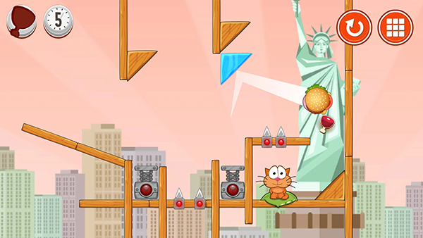 5、通过合理操作让汉堡滚落到猫咪身边即可完成关卡。有时候需要利用斜坡、弹簧等道具来调整食物运动轨迹。