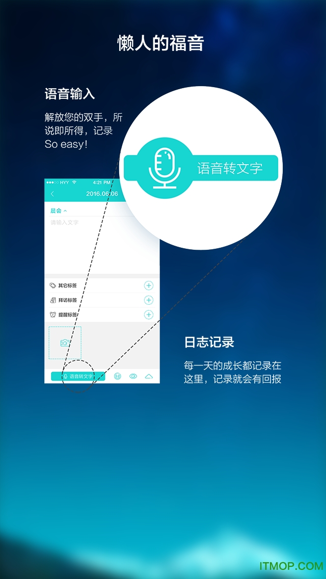 修复了语音转文字时特殊名词识别不准的问题,优化了金融、医疗等专业领域的词库。2.日志编辑界面全面升级,新增富文本格式工具栏,支持调整字体颜色、添加待办清单等。3.团队管理模块新增权限分级系统,支持设置不同级别的数据查看权限。4.优化了数据同步机制,大文件传输速度提升300%。5.新增黑暗模式,保护夜间使用者的眼睛。