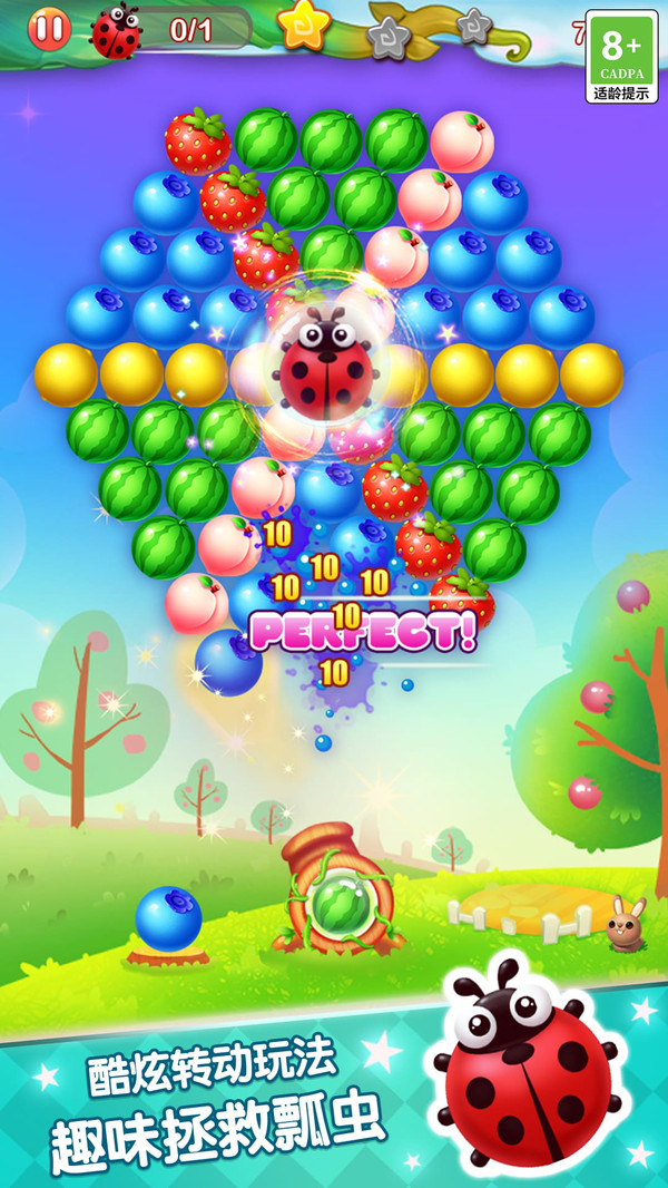 2、游戏融入炫酷的旋转玩法,有趣的拯救小瓢虫任务,以及多色精致的水果泡泡设计。