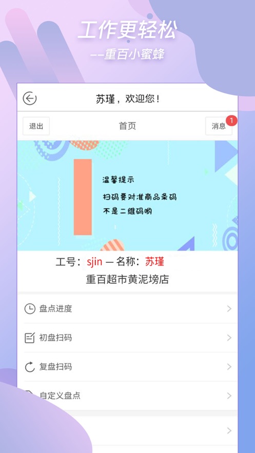 1、智能盘点系统:员工登录重百小蜜蜂app后,可以快速进入专业的盘点工具界面。该系统支持条码扫描、批量录入等多种盘点方式,大幅提升盘点效率和准确性。