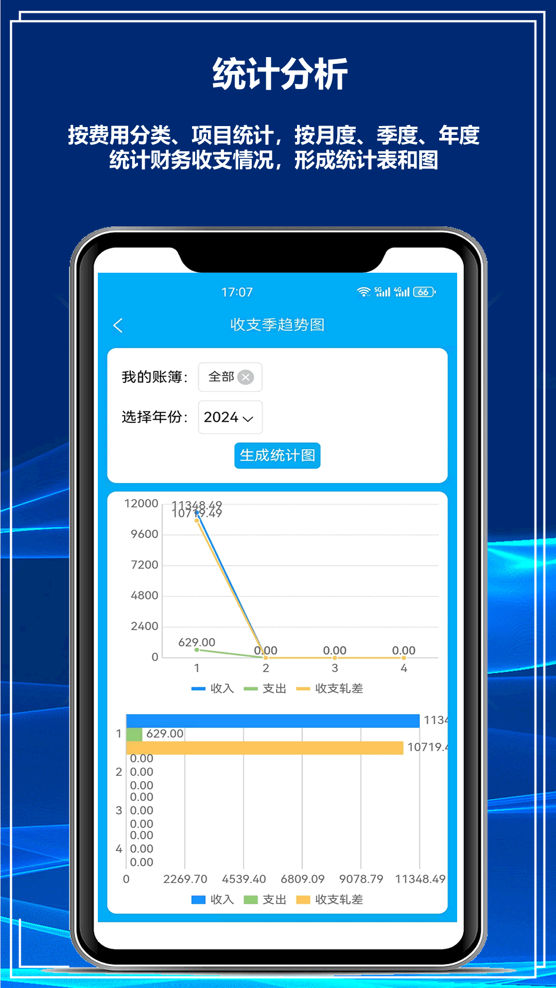 4.图表分析:通过动态饼图、趋势折线图等十余种可视化图表,直观呈现收支结构和变化规律,辅助财务决策。