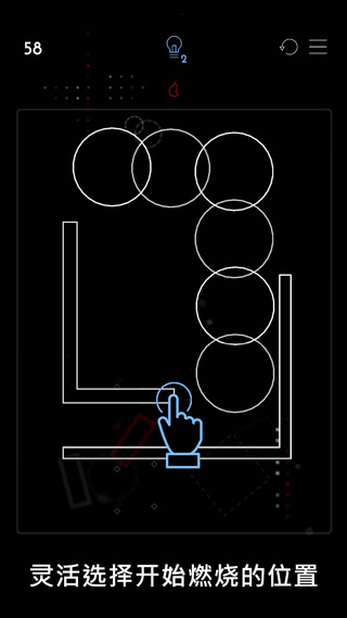 通盘考虑之后点击你决定开始燃烧的起点位置,观察伴有火花的燃烧的导火索。游戏中的每个图形都有特定的燃烧时间和传播特性,玩家需要预判燃烧路径和连锁反应。如果你能控制每个图形的燃烧结束位置,每个图形燃烧完之后的闪光就会点燃附近的其它图形!随着游戏深入,玩家还需要考虑风向、障碍物等环境因素,制定最优解谜策略。