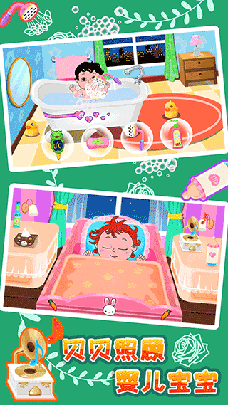 在最后的游戏环节中,小朋友需要照顾摇篮中的宝宝入睡。这个环节包含了喂奶、安抚、盖被子等一系列温馨互动,让孩子体验完整的照顾流程。游戏特别注重细节表现,每个动作都有生动的动画效果,增强游戏的趣味性和真实感。