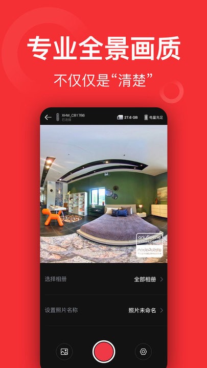 实时查看设备装备,app连接了全景相机之后即可在此查看设备连接状态与电量、存储容量;