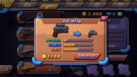 您还可以点击已有的武器,花费一些金币进行升级。升级系统采用可视化进度条设计,玩家可以清晰看到每次强化带来的具体数值提升,做出最优升级决策。