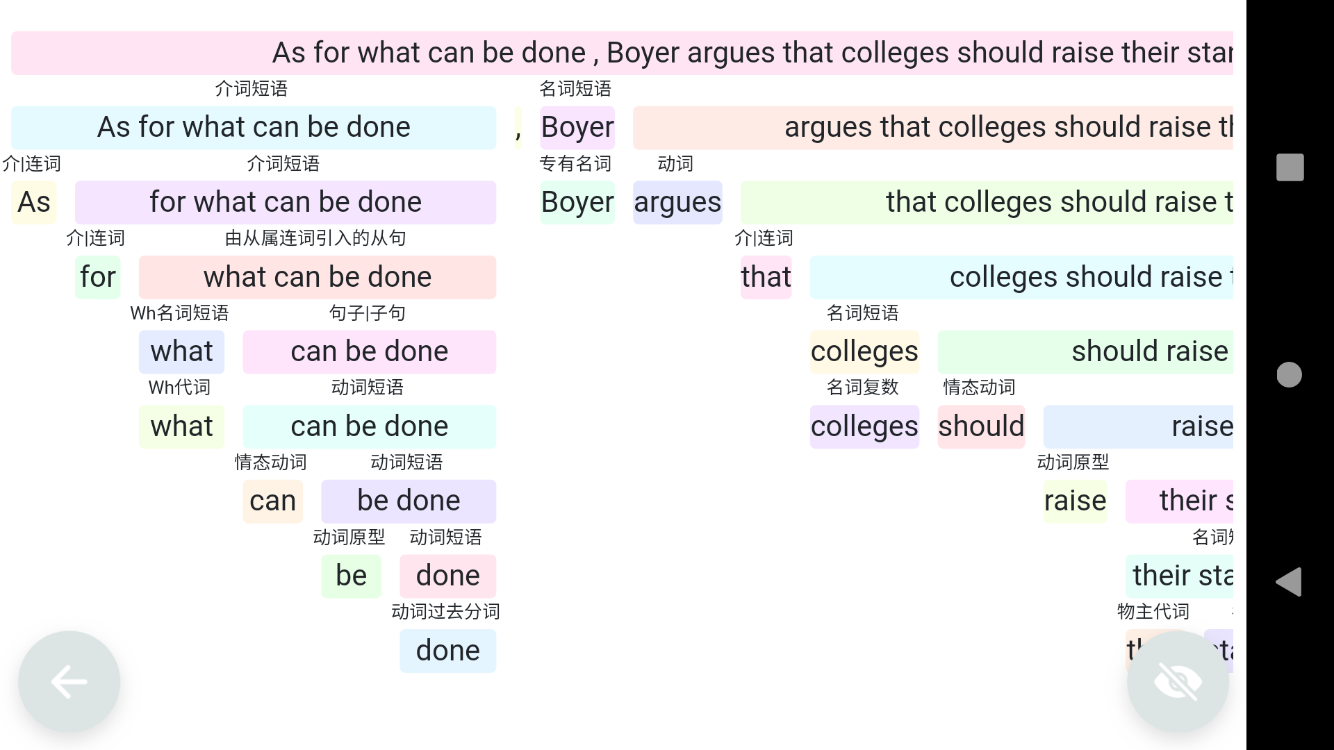 考研英语长难句精心收录了2337句具有代表性的英文长难句,这些句子均来自历年考研真题和权威外刊,每句都值得反复研读练习。软件采用创新的交互式学习模式,支持生词即点即查功能,只需轻触屏幕就能立即获取单词释义和发音。更值得一提的是,软件通过树状图、颜色标注等方式直观展示句子语法成分,让复杂的句子结构一目了然。它能有效帮助英语学习者摆脱面对长难句时的困惑,逐步培养快速解析长难句的能力,为考研英语阅读和翻译打下坚实基础。
