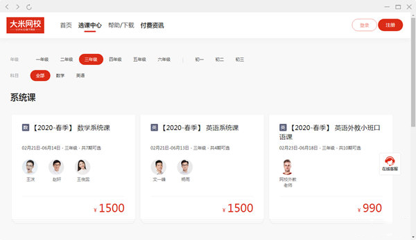 大米网校提供四大类课程:系统课是长期开设的学科辅导课程,按学期设置,帮助学生系统掌握各科知识;英语外教小班课采用小班制教学,重点提升听说能力;辅修专项课针对特定知识点或能力短板进行强化训练;活动课则涵盖学科拓展和素质培养等内容。