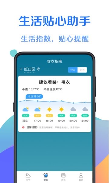 根据当日本地天气状况提供相应的生活建议:紫外线、钓鱼指数、穿衣指数、洗车指数、感冒指数、运动指数、旅游指数等,助您生活旅游、穿衣洗车钓鱼通掌握。建议内容由专业气象专家团队制定。