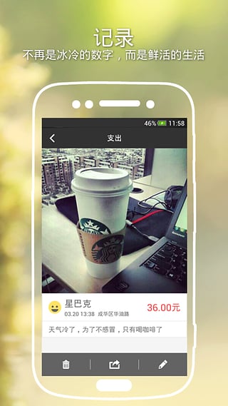 简洁方便的纪录您的消费经历。在记账时,通过时间、地点、心情和图片更好纪录您独特的消费经历。系统会自动识别消费场景,智能分类记账项目,让记账过程更加轻松高效。