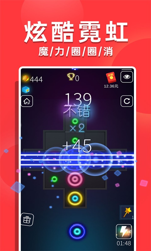 任意方向出现三个连续且颜色相同的圈圈就可以释放魔力,消除圈圈:连击系统让连续消除产生分数加成,最高支持10连击的爆炸效果
