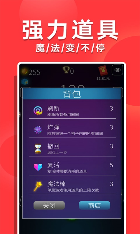 -超多道具帮你解决难题,再也不怕失败啦:提供15种功能各异的道具,包括全屏消除、颜色转换等强力辅助