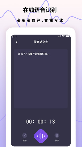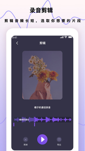 支持电话录音、录音剪辑、录音转文字、视频提取音频和在线语音翻译的功能,广泛应用于商务会议、老师讲课培训录音、取证录音、通话录音、会议记录、学习笔记等各种场景。软件功能全面且专业,操作界面友好,是移动办公和学习的高效工具。