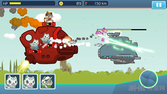 除了喵喵的攻击之外,飞船本身也有主炮进行攻击。主炮充能满了之后可以点击右下角主炮发射按钮,进行主炮攻击,主炮的攻击力还是非常可观的。在用完一发之后,需要等待其下次充满才能再次使用。主炮的时机选择非常重要,可以用来快速消灭精英敌人或打断Boss的特殊技能。
