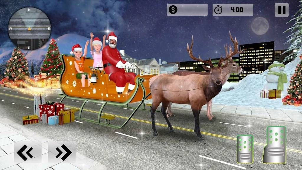 模拟驾驶的扮演类游戏,扮演圣诞老人骑麋鹿,增强游戏的代入感,还能收集不同的麋鹿和雪橇皮肤。