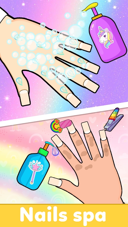 游戏中包括涂指甲油、贴贴纸、装饰小珠子等操作。游戏界面美丽优雅,音乐悠扬,让孩子们沉浸在美妙的体验中。此外,游戏还有以下特色和玩法值得您了解。游戏特别设计了渐进式难度系统,从基础的纯色美甲到复杂的艺术创作,逐步引导孩子掌握美甲技巧。每个关卡都设有创意主题,比如公主派对、海洋世界等,激发孩子的想象力。