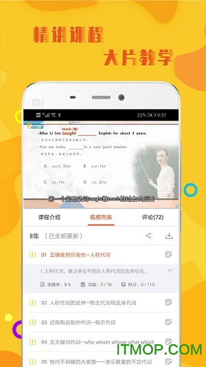 初中英语语法涵盖了初中阶段所有重要语法知识点,包括零点奇迹系列课程:宾语从句、名词、代词、冠词、动词、数词、形容词、易混淆动词辨析、副词等专题讲解。词汇学习模块包含初中易错词汇、情感交际类词汇、学业竞争类词汇、职业自然旅游类词汇、人物修饰类词汇等分类词汇表,以及词汇进阶第一季、第二季和高频单词趣味学等特色内容。【我的课程】功能让学习更便捷,可以随时查看学习进度和已完成内容。【学习计划】根据个人学习情况智能推荐学习内容,帮助学生制定个性化学习方案,快速提升英语水平。