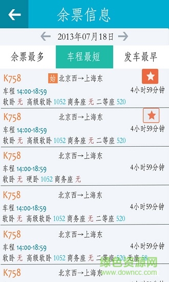 车次查询:输入出发地和目的地即可查询符合条件的车次信息,支持模糊搜索和常用车站收藏功能。