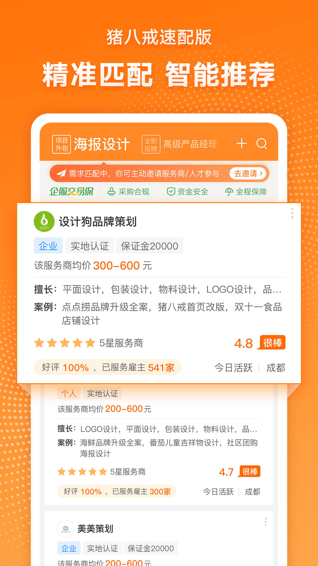 作为猪八戒网旗下核心产品,猪八戒速配版APP致力于打造更高效的一站式企业服务平台。平台深度整合产业链资源,通过数字化手段重构服务交易流程,目前已服务超过50万家企业客户。凭借强大的技术中台和标准化服务体系,持续为企业提供智能化、透明化的专业服务解决方案。