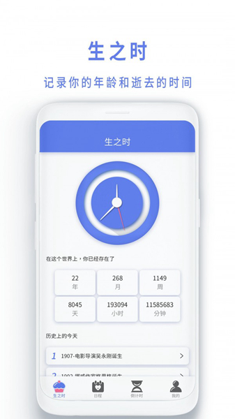 【生之时】输入自己的出生日期,自动为您计算出您在这个世界上存在的时间,精确到年月日、天小时分钟!同时提供生命进度条可视化展示,让您更珍惜当下时光