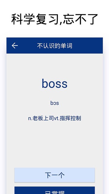 【AI出词】智能算法,完美遵循艾宾浩斯遗忘曲线所揭示的记忆规律,由简入难,反复巩固,科学记忆神助攻!系统会根据用户记忆情况自动调整复习计划。
