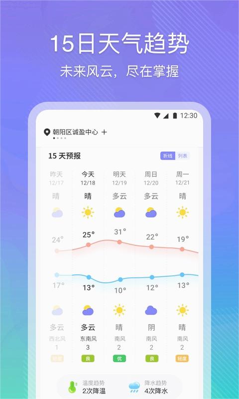 云朵天气凭借其全面的功能和贴心的服务赢得了广大用户的喜爱。首先,它提供未来15天的天气预报,让您提前规划行程;其次,空气质量监测功能让您随时了解周边环境状况;此外,它还提供超全的天气指数,包括穿衣指数、洗车指数、运动指数等,为您的生活提供全方位的天气参考。无论是日常生活还是特殊场合,云朵天气都能为您提供最贴心的天气服务。