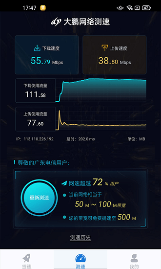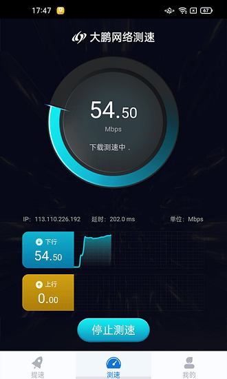 作为专业级测速工具,大鹏网速大师全面覆盖中国电信、中国联通等主流运营商网络,独创700M极速提速技术,解决用户卡顿痛点。其5G/WiFi双模测速引擎可实时显示下载、上传速率及网络延迟,并自动生成可视化报告。新增的智能诊断功能能快速定位信号弱、DNS异常等常见问题,配合24小时在线客服,为用户提供从测速到优化的全流程服务。