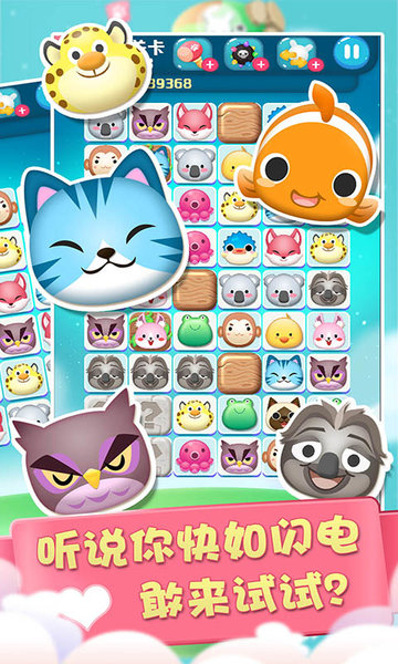 在特定时间内消除所有动物即可通关,随着关卡提升,时间限制会越来越严格,考验你的反应速度和观察能力。