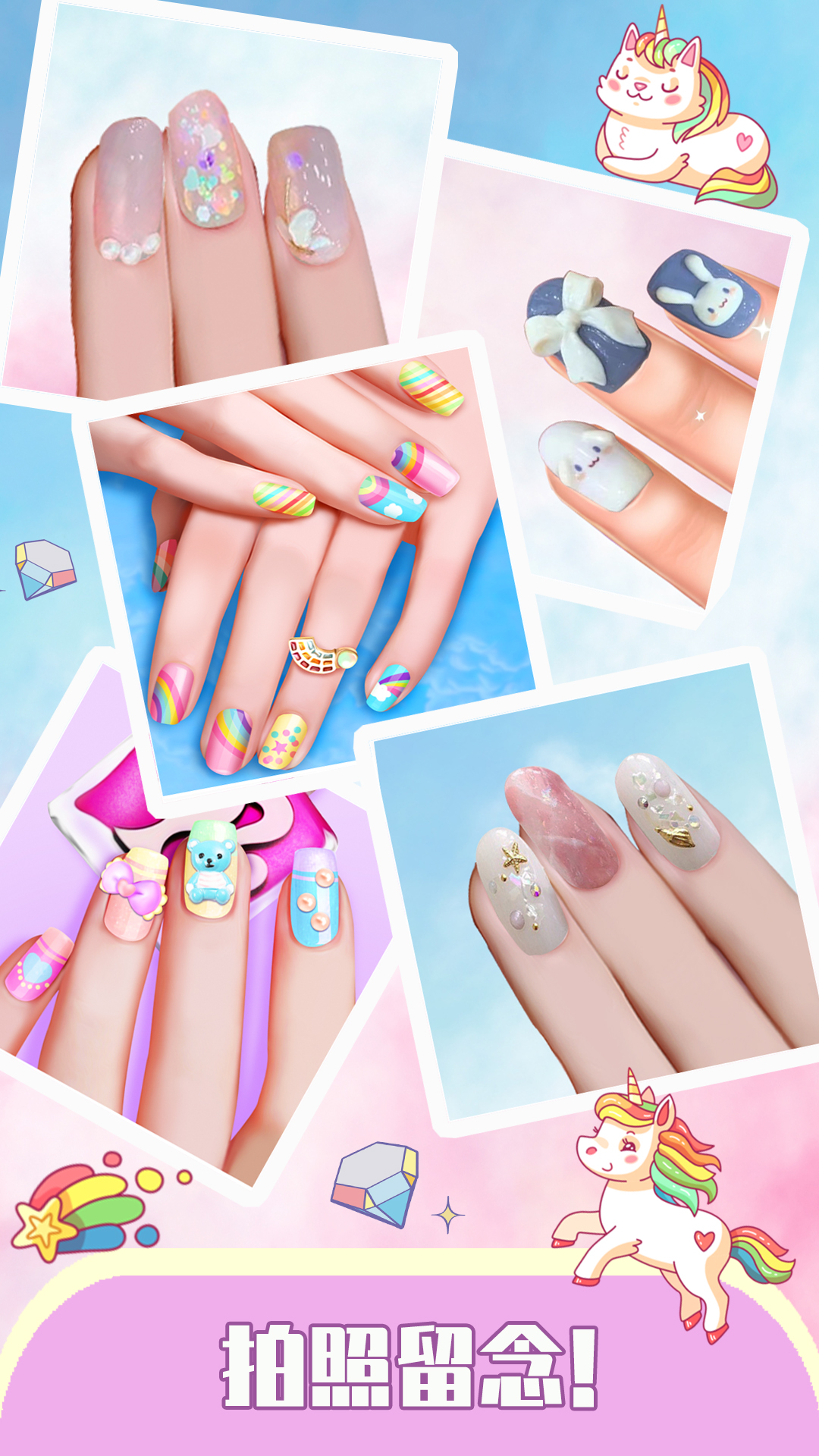 可爱漂亮的饰品,时尚的指甲套装,风格各异,是不是都想要试一试呢?游戏包含12种不同风格的美甲套装,满足各种场合需求。