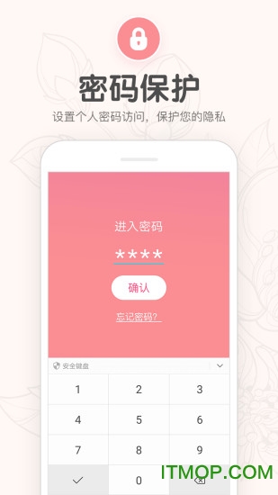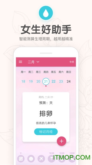 预测:只要输入你的大姨妈月经周期间隔和大姨妈月经时间长度,就能自动预测推算你的经期日期,避免经期的每一次尴尬;算法会随着使用时间增加而不断优化,预测准确率最高可达95%;