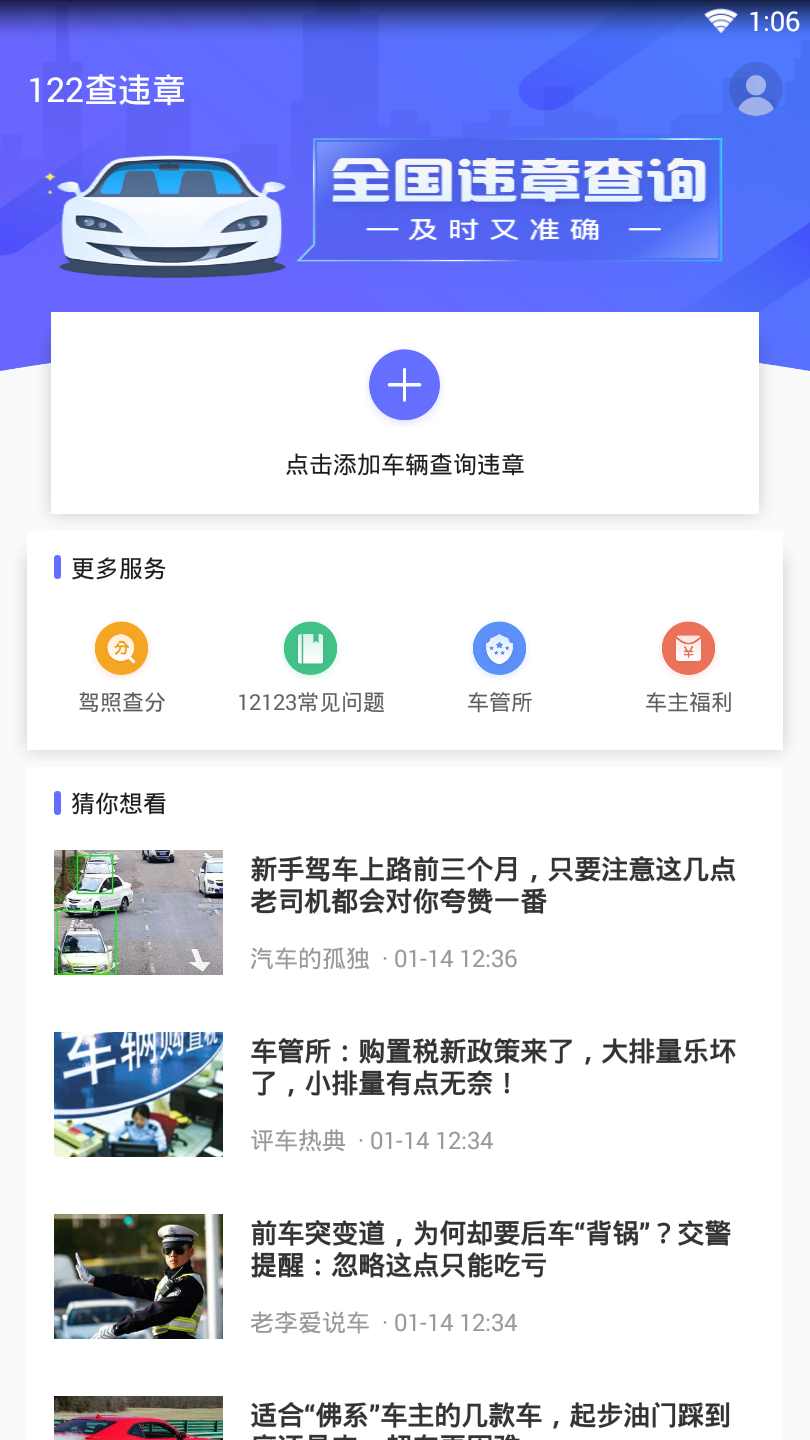 122查违章是一款专为车主打造的智能汽车服务软件,致力于为用户提供便捷高效的违章查询与管理体验。通过直连全国交通数据平台,该应用可实时获取300多个城市的违章信息,确保数据准确可靠。除了基础的查询功能,还支持在线缴纳罚款、驾驶证记分提醒等实用服务,让您无需奔波即可轻松处理车辆事务。更有贴心的车险到期提醒、车辆估值等增值功能,全方位满足车主需求。无论是日常用车还是长途出行,122查违章都是您值得信赖的行车助手。