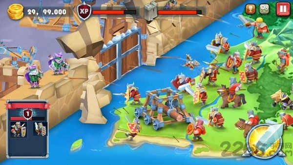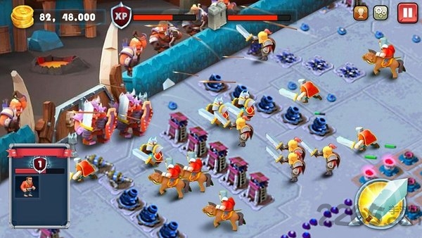 游戏关卡多,每30关还会有越来越强的攻城BOSS!体验强大的对手带来的压力吧!从森林哨站到雪山要塞,每个战场都有独特地形机制,比如沼泽会减速部队,悬崖可设置滚石陷阱。