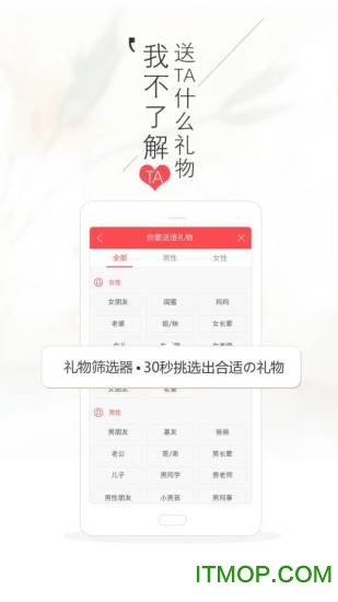 礼物筛选神器--特有的"挑礼物"功能可以根据收礼对象的年龄以及送礼场合来推荐品质好礼。毕业季送老师,初次见面送客户...都能30秒挑出合适的礼物;系统会结合用户评价和专家建议给出最优推荐。