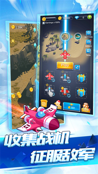 基础操作与战斗系统:游戏创新性地将街机射击精髓移植到移动平台,通过智能触控优化实现精准操控。战机自动射击机制降低入门门槛,而动态难度系统会根据玩家水平实时调整敌机强度,确保不同段位玩家都能获得恰到好处的挑战。战斗中可拾取七类道具:金币用于战后强化,能量球激活特殊技能,护盾提供临时保护,核弹实现全屏清场,僚机召唤辅助火力,磁铁自动吸附道具,医疗包恢复战机耐久。每场战斗都是操作与策略的双重考验。