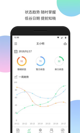 情绪状态、智力状态、体力状态,随时掌握,低谷日期,提前知晓。系统采用动态折线图展示三节律变化曲线,支持未来30天趋势预测,重要日期自动标注提醒,助您避开状态低谷期安排重要事项。
