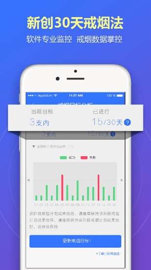 《蓝白戒烟》最具特色的就是其专业的戒烟报告系统。原创的30天阶段戒烟法配合软件的智能监控,让你随时掌握戒烟数据。人性化的压制烟瘾功能配合实时技巧提示,帮助你在关键时刻战胜烟瘾。通过积累经验值提升等级,让戒烟过程充满成就感。健康指数系统让你清晰了解自己的戒烟状况,各项指标控制情况一目了然。